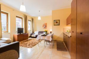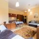 Accommodation comprises an elegant ground floor studio with a fully equipped kitchenette including a refrigerator, stovetop, microwave, electric kettle, kitchenware and dining table. The second-floor apartment features a balcony along with similar kitchenette facilities. Rooms provide heating, seating areas including sofa beds, non-feather pillows, towels and bed linen. Each unit comes with ironing facilities such as an iron and ironing board plus safety deposit boxes for added security.