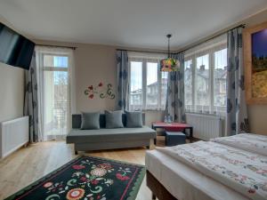 Accommodation ranges from double to triple rooms and includes one apartment featuring seven beds across one bedroom. Each room comes equipped with heating, a flat-screen TV, wardrobe or closet space, sofa seating areas in many units, and private bathrooms complete with showers alongside complimentary toiletries such as shampoo and body soap. Some rooms offer balconies that provide scenic views of either the Tatras mountain range or cityscape.