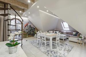 Rezydencja Sienkiewicza offers lift access directly to rooms plus ample private parking onsite at no extra charge. Outdoor furniture adorns each balcony providing an inviting space for outdoor dining while guests can relax in the shared garden area.